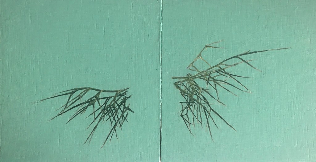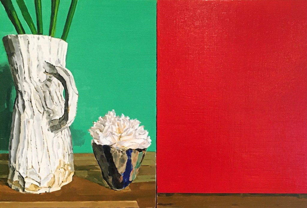 During lockdown, I took refuge in these small, technical pieces or etudes as I came to think of them. The subjects are often closer to home and draw on my love of flowers (I worked as a florist with Saskia Havekes in Sydney for 5 years), vessels, the domestic interior and painting itself. They are also the means with which I could attend to and indulge my passion for the formal qualities of painting, namely colour, tone, mark-making and proportion. Not deliberately, but definitely consistently, I draw on the diptych as a means of creating a viewfinder (or armature) to frame the main subject and open it out to the more abstract forces governing perception and our relationship to sight.