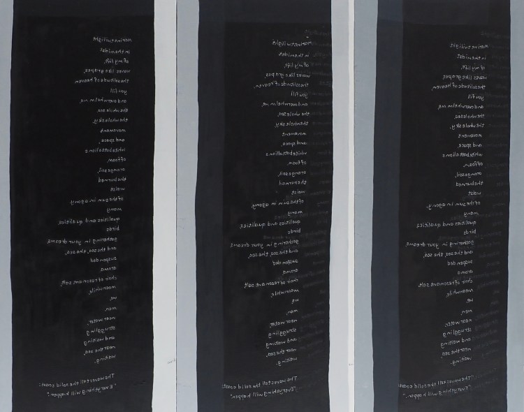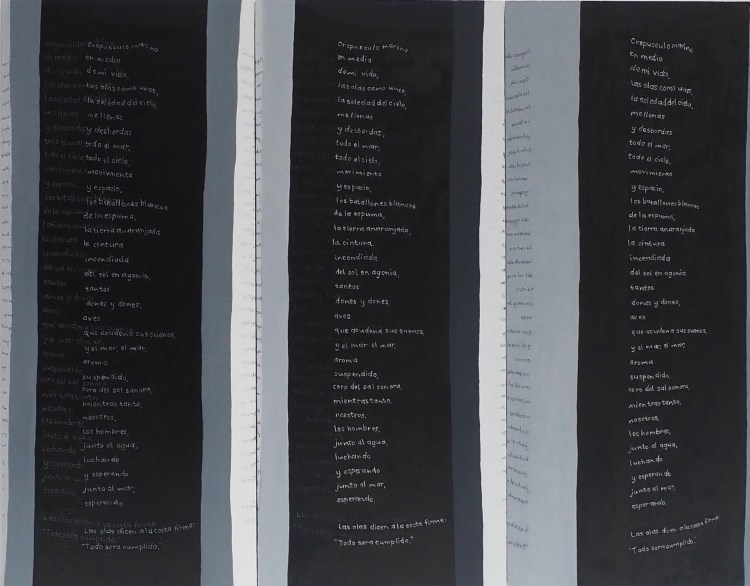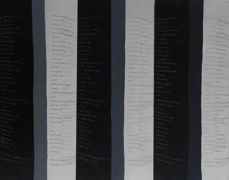The sculpture on which the paintings are based. I have sewn Neruda’s poem on the fabric in Spanish and English and facing forwards and backwards. I then took a series of photographs of this cylindrical structure rotating 360 degrees. Each panel equates to one of the stills.